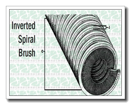 英文名Inverted brush,Spiral brush或者Screwed brush,由剛性部件(毛刷底座)和柔性部件(刷絲部分)組成,呈內(nèi)螺旋或者外螺旋狀,刷絲常見為尼龍塑料絲、金屬絲如銅絲或鍍銅鋼絲等,底座常見為鍍鋅鐵(Galvanized steel),或有不銹鋼底座,但并不多見。